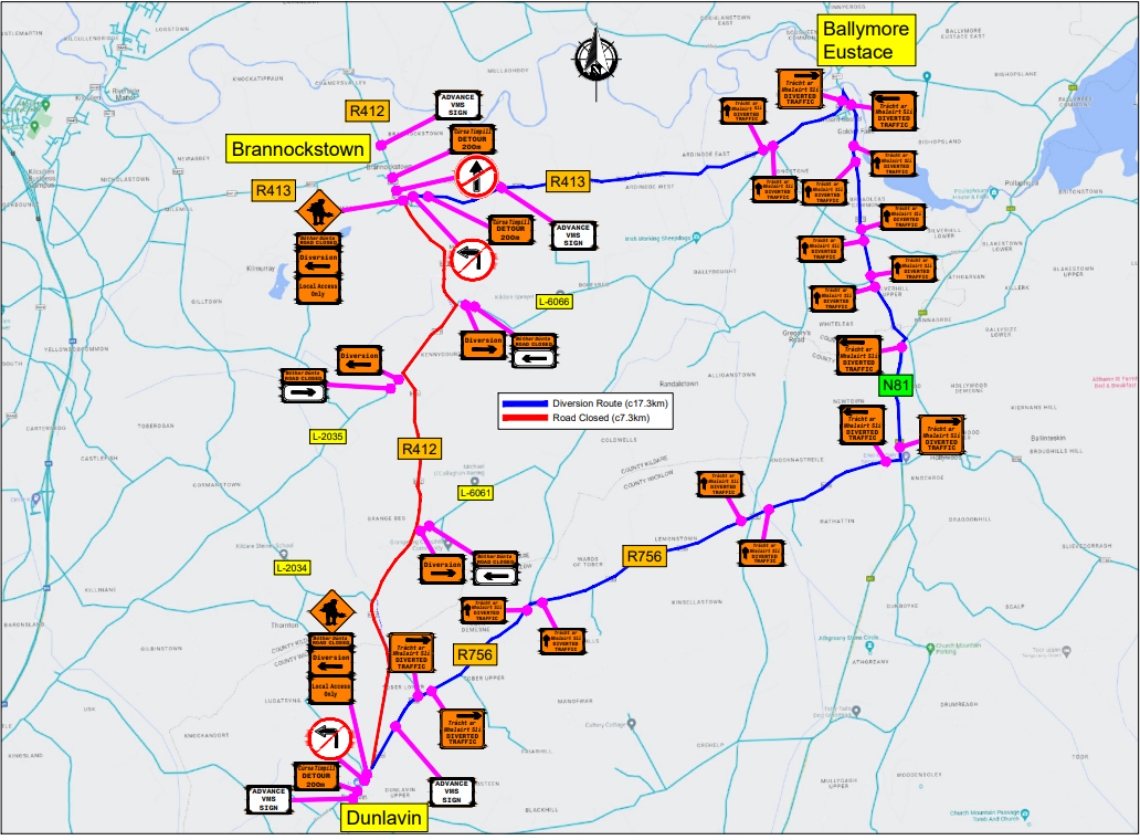 Southbound vehicles travelling on the R412 (Brannockstown to Dunlavin road) must turn left on to the R413 at Brannockstown and continue along the R413 (circa 5.5km) and then divert right onto the R411 at Ballymore Eustace and continue along the R411 (circa 3km), then divert right onto the N81 and continue along the N81 (circa 1.4km) and divert right onto the R756 at Hollywood Cross and continue along the R756 (circa 7.3km) as far as its junction with the R412 in Dunlavin Village.