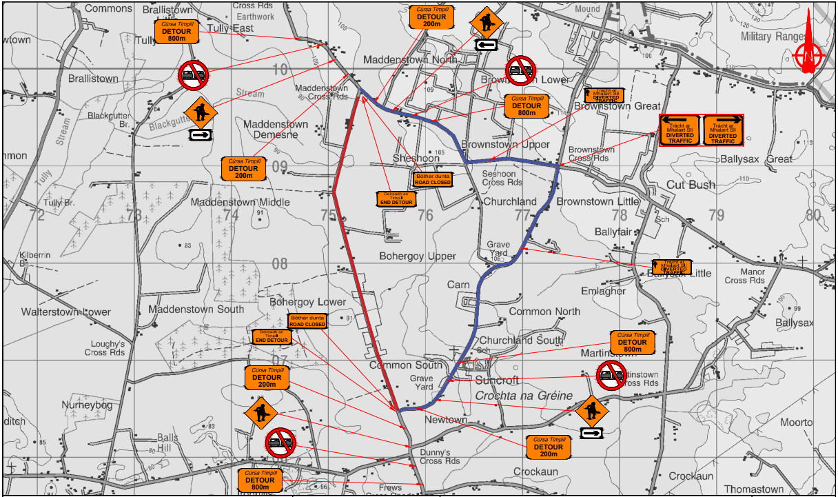 Diversionary routes will be clearly signposted, as agreed with the Council and An Garda Síochána. Emergency access and restricted local access will be maintained.