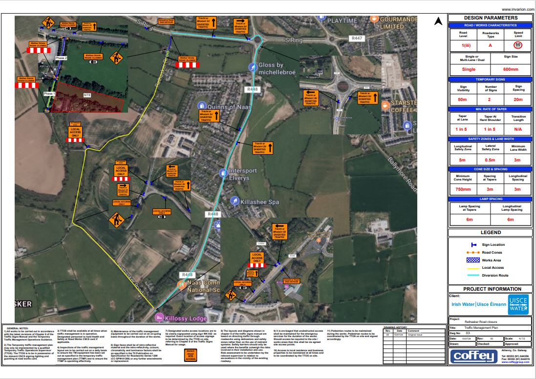 Diversionary routes will be clearly signposted, as agreed with the Council and An Garda Síochána. Emergency access and restricted local access will be maintained.