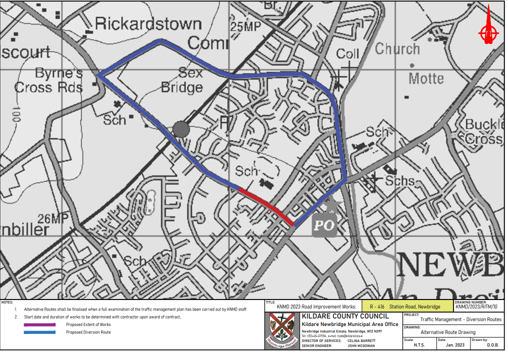 Northbound Traffic will be directed in a westbound direction on Main Street Newbridge (R445), towards the junction of R445/R416/L7041 beside the Liffey Bridge, traffic will directed to turn left onto the L7041 Canning Place/Sex Road, then travel northbound towards the Roundabout abutting Newbridge College. At the Roundabout take the first exit staying on Sex Road (L7045) passing over Sex Bridge heading to the Roseberry Hill/Richardstown Roundabout, taking the first exit continuing on the L7045, travelling in a Westbound direction passing Sarsfields GAA Club to Byrnes Cross (Junction of the R416/L7045/L7036).