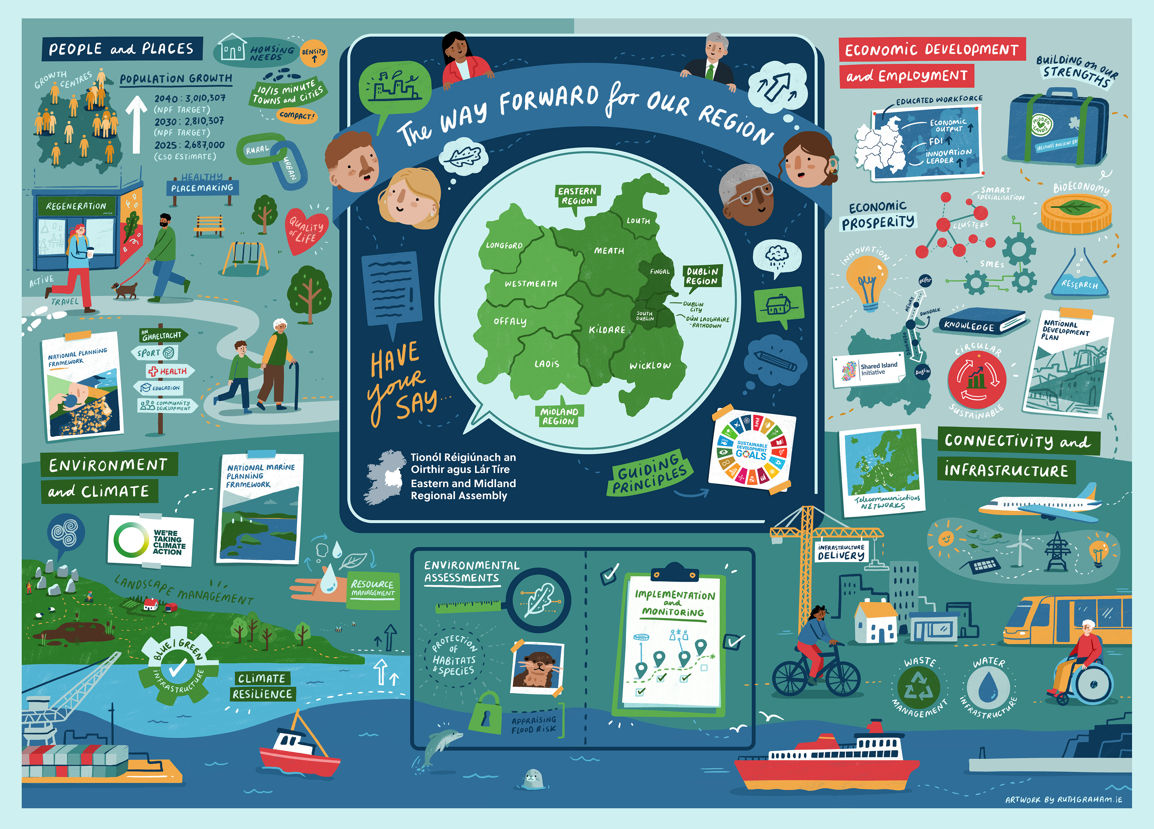 The Eastern and Midland Regional Assembly are at the earliest stage of reviewing the Regional Spatial and Economic Strategy (RSES) and are seeking input from communities, stakeholders and all interested parties on the future of our region. Your feedback will help shape the preparation of a new draft RSES that supports sustainable social, environmental and economic development for everyone.