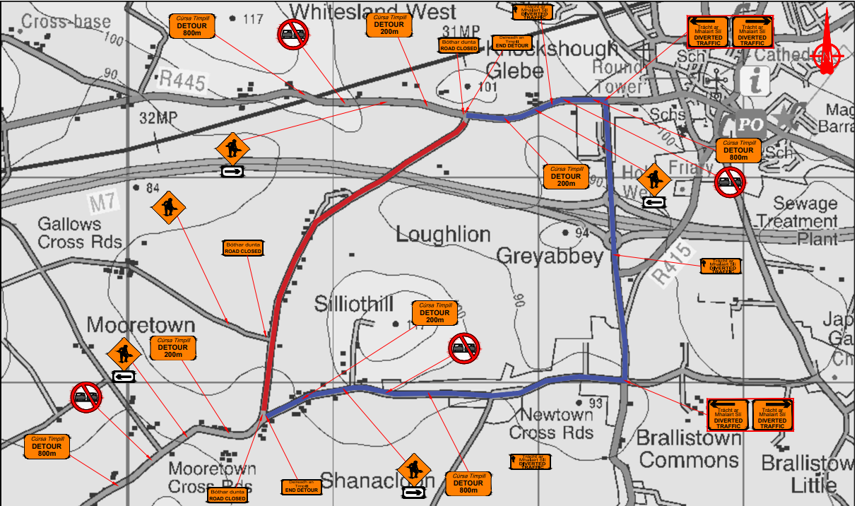 At the junction L3004/L7024 head eastbound on the L7024 to the junction of L7024/R415 (Newtown Cross). Turn left and travel northbound towards the junction of R445/R415. At the junction turn left onto the R445 and head westbound to the junction of R445/L3004 where the diversion ends.