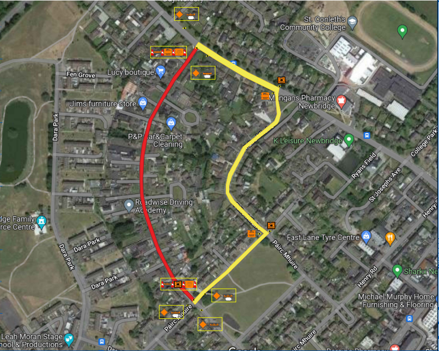 Traffic travelling on the L-70691-3 in Pairc Mhuire will be directed past the green verge area in the estate. Traffic will take a left turn through Pairc Mhuire estate. Traffic can turn both right and left onto the R416 Station Road where the diversion ends.