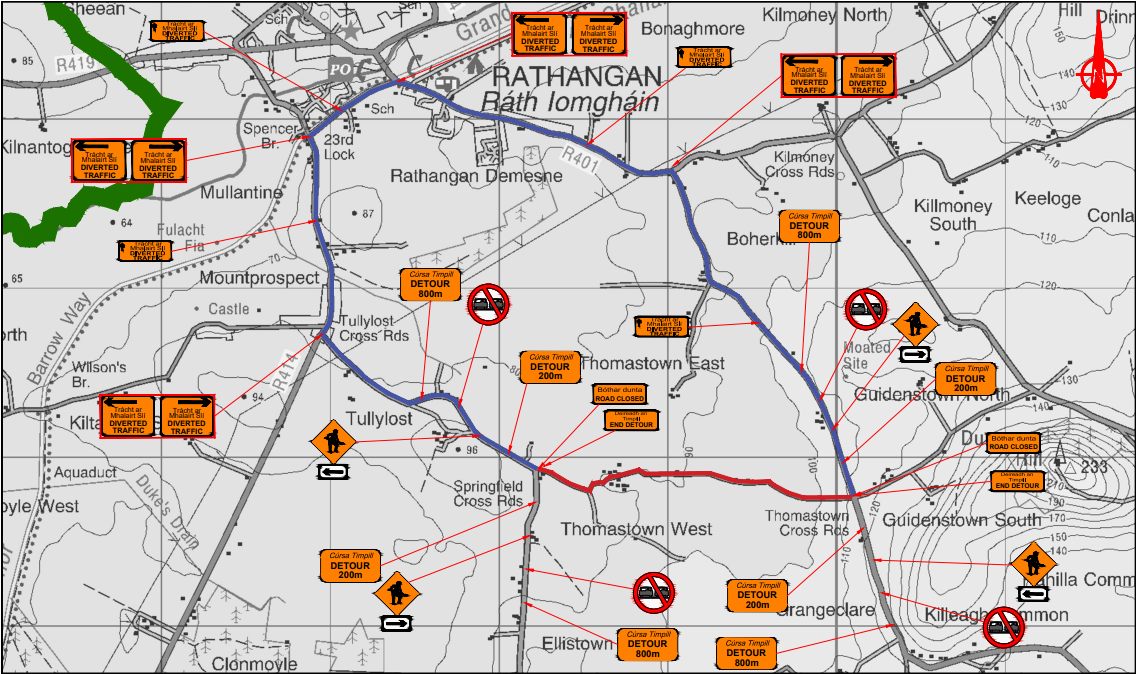 Diversionary routes will be clearly signposted, as agreed with the Council and An Garda Síochána. Emergency access and restricted local access will be maintained.